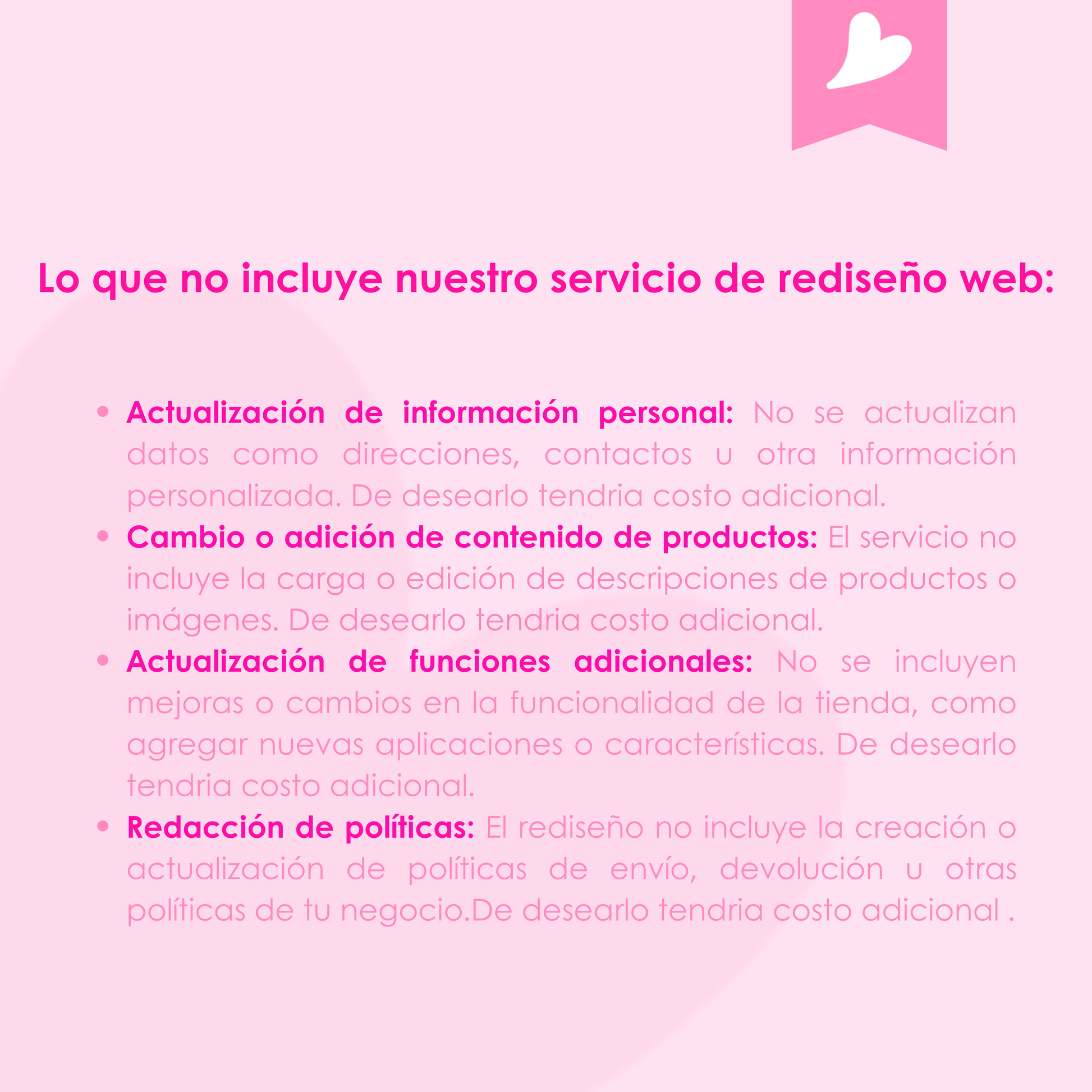 - Redacción de políticas: El rediseño no incluye la creación o actualización de políticas de envío, devolución u otras políticas de tu negocio.De desearlo tendria costo adicional .