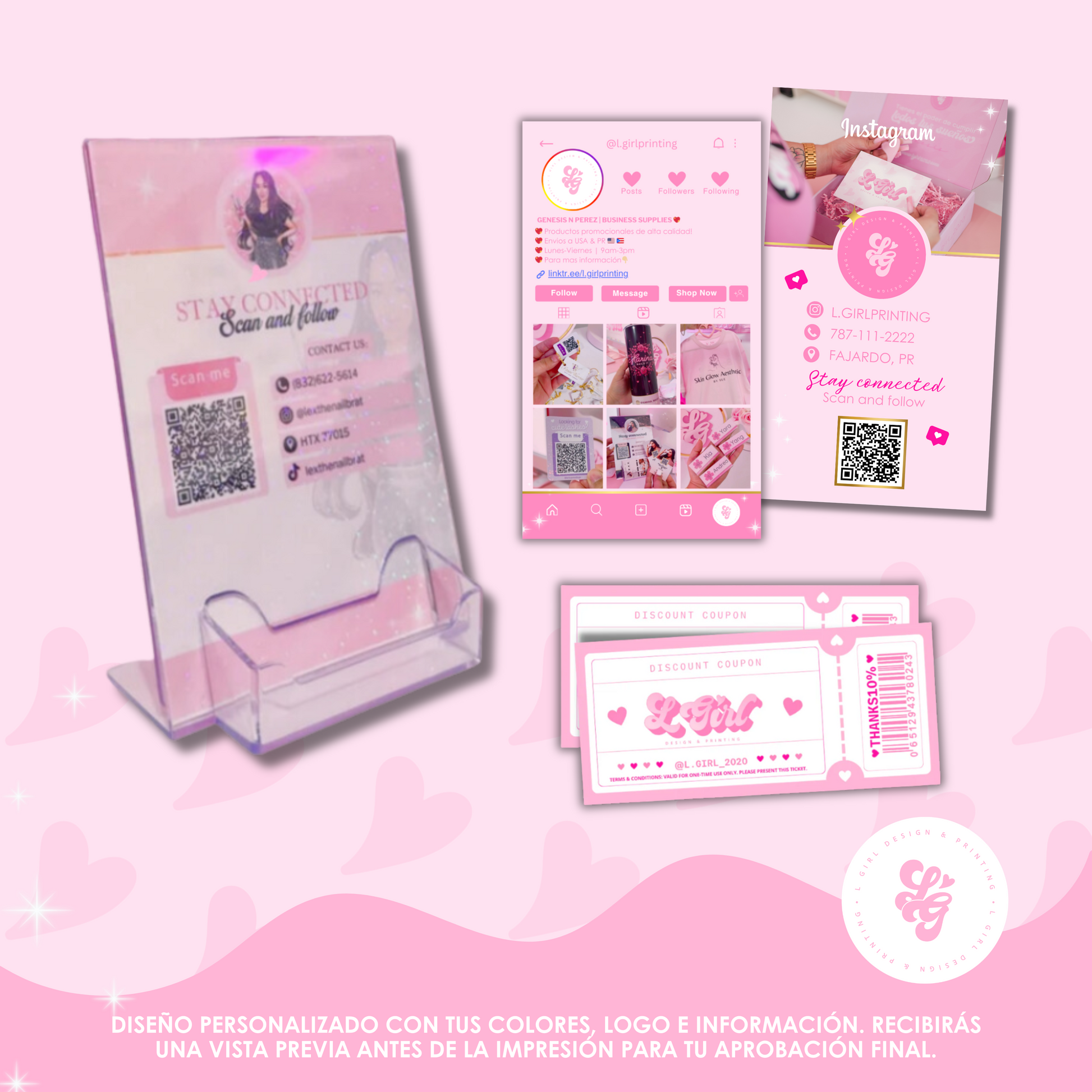 Combo Promocional. Incluye un cuadro personalizado con un código QR que te permitirá conectar con clientes potenciales en segundos. Además, cuenta con tarjetas de presentación estilo Instagram, perfectas para mostrar tu negocio de manera creativa y profesional. ¡Haz crecer tu marca hoy!